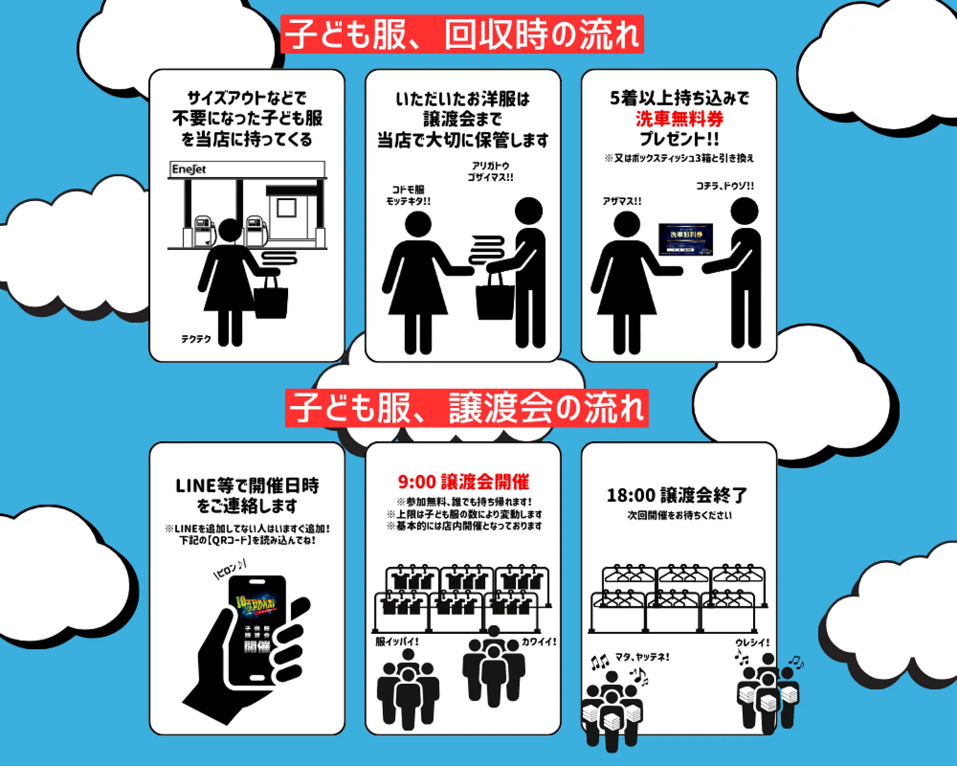 2つ目は、子育て世代を応援する「子供服譲渡会(無料)」です。お子様の成長は本当に早いもの。「ついこの間買ったばかりなのにもうサイズアウトしてしまった…」そんなお悩みはありませんか?この譲渡会は、どなたでもご参加いただけます。